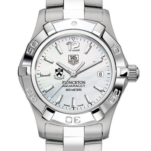 #Princeton TAG Heuer women's Aquaracer watch with Princeton seal in black; "Princeton" is written underneath. White mother of pearl dial with polished markers. Brushed and Polished steel bracelet with double security clasp. Case stamped from a solid block of stainless steel (27 mm diameter.) Unidirectional rotating bezel. Luminescent hands and markers for optimum readability and radiance. Screw-in crown and caseback for water resistance to 300 meters. Swiss-made Quartz movement. Scratch-resistant sapphire crystal. Unique TAG Heuer presentation box. TAG Heuer international two-year warranty.